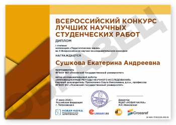 II Всероссийский научно-исследовательский конкурс ВСЕРОССИЙСКИЙ КОНКУРС ЛУЧШИХ НАУЧНЫХ СТУДЕНЧЕСКИХ РАБОТ Код конкурса: НИК-639 Дата проведения: 17 июня 2026 г. К участию в конкурсе принимаются статьи объемом от 5 до 12 страниц на русском и английском языках. Авторами одной конкурсной работы могут быть несколько человек. По итогам конкурса его участники получают: 1. Публикацию своей конкурсной работы (статьи) в сборнике статей конкурса «ВСЕРОССИЙСКИЙ КОНКУРС ЛУЧШИХ НАУЧНЫХ СТУДЕНЧЕСКИХ РАБОТ». Сборнику присваиваются УДК, ББК, ISBN; 2. Именные Дипломы (I, II или III степени) по решению редколлегии; 3. Размещение сборника и публикации участника в Научной электронной библиотеке eLIBRARY (Договор №467-03/2018K); 4. DOI - международный цифровой идентификатор публикации (см. условия участия); 5. Бесплатный сборник статей конкурса «ВСЕРОССИЙСКИЙ КОНКУРС ЛУЧШИХ НАУЧНЫХ СТУДЕНЧЕСКИХ РАБОТ» (в электронном виде); 6. По итогам конкурсов предоставляется выписка из Протокола рассмотрения и оценки конкурсных работ и другие необходимые для отчетности документы (по запросу участника). Сборник статей конкурса формируется в течение 5 дней после окончания приема конкурсных работ (статей) и будет размещен на нашем сайте в разделе Архив конкурсов. Оргвзнос: 990 руб. |