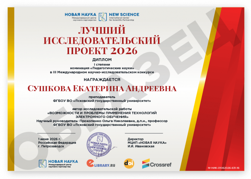 III Международный научно-исследовательский конкурс ЛУЧШИЙ ИССЛЕДОВАТЕЛЬСКИЙ ПРОЕКТ 2026 Код конкурса: НИК-631 Дата проведения: 1 июня 2026 г. К участию в конкурсе принимаются статьи объемом от 5 до 12 страниц на русском и английском языках. Авторами одной конкурсной работы могут быть несколько человек. По итогам конкурса его участники получают: 1. Публикацию своей конкурсной работы (статьи) в сборнике статей конкурса «ЛУЧШИЙ ИССЛЕДОВАТЕЛЬСКИЙ ПРОЕКТ 2026». Сборнику присваиваются УДК, ББК, ISBN; 2. Именные Дипломы (I, II или III степени) по решению редколлегии; 3. Размещение сборника и публикации участника в Научной электронной библиотеке eLIBRARY (Договор №467-03/2018K); 4. DOI - международный цифровой идентификатор публикации (см. условия участия); 5. Бесплатный сборник статей конкурса «ЛУЧШИЙ ИССЛЕДОВАТЕЛЬСКИЙ ПРОЕКТ 2026» (в электронном виде); 6. По итогам конкурсов предоставляется выписка из Протокола рассмотрения и оценки конкурсных работ и другие необходимые для отчетности документы (по запросу участника). Сборник статей конкурса формируется в течение 5 дней после окончания приема конкурсных работ (статей) и будет размещен на нашем сайте в разделе Архив конкурсов. Оргвзнос: 990 руб. |