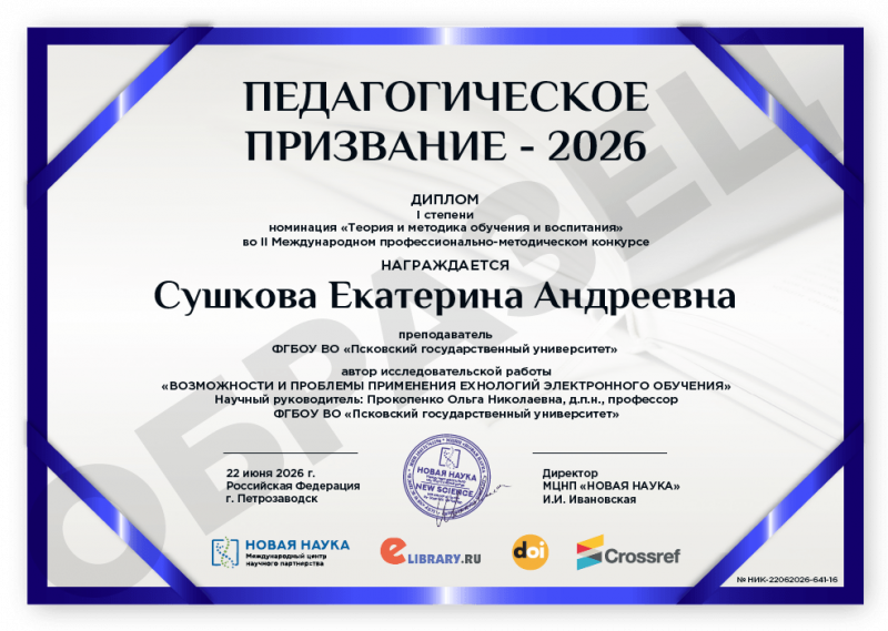 II Международный профессионально-методический конкурс ПЕДАГОГИЧЕСКОЕ ПРИЗВАНИЕ - 2026 Код конкурса: НИК-641 Дата проведения: 22 июня 2026 г. К участию в конкурсе принимаются статьи объемом от 5 до 12 страниц на русском и английском языках. Авторами одной конкурсной работы могут быть несколько человек. По итогам конкурса его участники получают: 1. Публикацию своей конкурсной работы (статьи) в сборнике статей конкурса «ПЕДАГОГИЧЕСКОЕ ПРИЗВАНИЕ - 2026». Сборнику присваиваются УДК, ББК, ISBN; 2. Именные Дипломы (I, II или III степени) по решению редколлегии; 3. Размещение сборника и публикации участника в Научной электронной библиотеке eLIBRARY (Договор №467-03/2018K); 4. DOI - международный цифровой идентификатор публикации (см. условия участия); 5. Бесплатный сборник статей конкурса «ПЕДАГОГИЧЕСКОЕ ПРИЗВАНИЕ - 2026» (в электронном виде); 6. По итогам конкурсов предоставляется выписка из Протокола рассмотрения и оценки конкурсных работ и другие необходимые для отчетности документы (по запросу участника). Сборник статей конкурса формируется в течение 5 дней после окончания приема конкурсных работ (статей) и будет размещен на нашем сайте в разделе Архив конкурсов. Оргвзнос: 790 руб. |