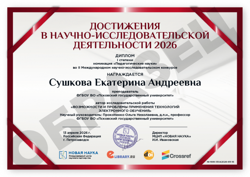 II Международный научно-исследовательский конкурс ДОСТИЖЕНИЯ В НАУЧНО-ИССЛЕДОВАТЕЛЬСКОЙ ДЕЯТЕЛЬНОСТИ 2026 Код конкурса: НИК-611 Дата проведения: 13 апреля 2026 г. К участию в конкурсе принимаются статьи объемом от 5 до 12 страниц на русском и английском языках. Авторами одной конкурсной работы могут быть несколько человек. По итогам конкурса его участники получают: 1. Публикацию своей конкурсной работы (статьи) в сборнике статей конкурса «ДОСТИЖЕНИЯ В НАУЧНО-ИССЛЕДОВАТЕЛЬСКОЙ ДЕЯТЕЛЬНОСТИ 2026». Сборнику присваиваются УДК, ББК, ISBN; 2. Именные Дипломы (I, II или III степени) по решению редколлегии; 3. Размещение сборника и публикации участника в Научной электронной библиотеке eLIBRARY (Договор №467-03/2018K); 4. DOI - международный цифровой идентификатор публикации (см. условия участия); 5. Бесплатный сборник статей конкурса «ДОСТИЖЕНИЯ В НАУЧНО-ИССЛЕДОВАТЕЛЬСКОЙ ДЕЯТЕЛЬНОСТИ 2026» (в электронном виде); 6. По итогам конкурсов предоставляется выписка из Протокола рассмотрения и оценки конкурсных работ и другие необходимые для отчетности документы (по запросу участника). Сборник статей конкурса формируется в течение 5 дней после окончания приема конкурсных работ (статей) и будет размещен на нашем сайте в разделе Архив конкурсов. Оргвзнос: 790 руб. |