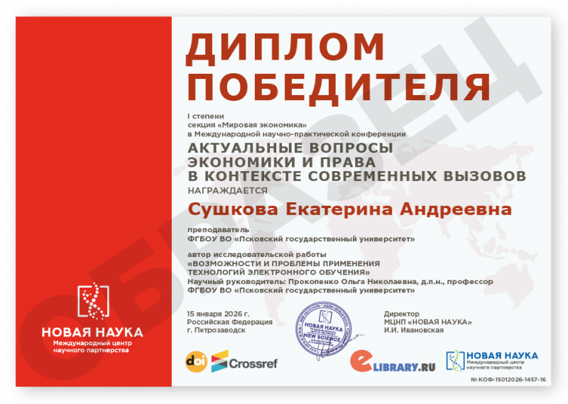 Международная научно-практическая конференция АКТУАЛЬНЫЕ ВОПРОСЫ ЭКОНОМИКИ И ПРАВА В КОНТЕКСТЕ СОВРЕМЕННЫХ ВЫЗОВОВ Код конференции: КОФ-1457 Дата проведения: 15 января 2026 г. К участию в конференции принимаются статьи объемом от 5 страниц. Сборник статей конференции с присвоением ISBN, УДК, ББК формируется в течение 3 дней после окончания приема статей и будет размещен на нашем сайте в разделе Архив конференций. Бесплатно каждому автору предоставляется: