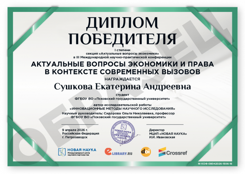 III Международная научно-практическая конференция АКТУАЛЬНЫЕ ВОПРОСЫ ЭКОНОМИКИ И ПРАВА В КОНТЕКСТЕ СОВРЕМЕННЫХ ВЫЗОВОВ Код конференции: КОФ-1506 Дата проведения: 9 апреля 2026 г. К участию в конференции принимаются статьи объемом от 5 страниц. Сборник статей конференции с присвоением ISBN, УДК, ББК формируется в течение 3 дней после окончания приема статей и будет размещен на нашем сайте в разделе Архив конференций. Бесплатно каждому автору предоставляется: