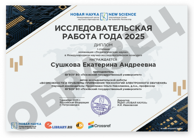Международный научно-исследовательский конкурс ИССЛЕДОВАТЕЛЬСКАЯ РАБОТА ГОДА 2025 Код конкурса: НИК-566 Дата проведения: 1 декабря 2025 г. К участию в конкурсе принимаются статьи объемом от 5 до 12 страниц на русском и английском языках. Авторами одной конкурсной работы могут быть несколько человек. По итогам конкурса его участники получают: 1. Публикацию своей конкурсной работы (статьи) в сборнике статей конкурса «ИССЛЕДОВАТЕЛЬСКАЯ РАБОТА ГОДА 2025». Сборнику присваиваются УДК, ББК, ISBN; 2. Именные Дипломы (I, II или III степени) по решению редколлегии; 3. Размещение сборника и публикации участника в Научной электронной библиотеке eLIBRARY (Договор №467-03/2018K); 4. DOI - международный цифровой идентификатор публикации (см. условия участия); 5. Бесплатный сборник статей конкурса «ИССЛЕДОВАТЕЛЬСКАЯ РАБОТА ГОДА 2025» (в электронном виде); 6. По итогам конкурсов предоставляется выписка из Протокола рассмотрения и оценки конкурсных работ и другие необходимые для отчетности документы (по запросу участника). Сборник статей конкурса формируется в течение 5 дней после окончания приема конкурсных работ (статей) и будет размещен на нашем сайте в разделе Архив конкурсов. Оргвзнос: 990 руб. |