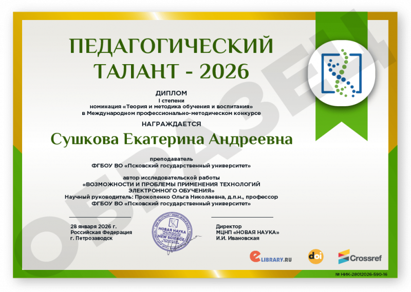 Международный профессионально-методический конкурс ПЕДАГОГИЧЕСКИЙ ТАЛАНТ - 2026 Код конкурса: НИК-590 Дата проведения: 28 января 2026 г. К участию в конкурсе принимаются статьи объемом от 5 до 12 страниц на русском и английском языках. Авторами одной конкурсной работы могут быть несколько человек. По итогам конкурса его участники получают: 1. Публикацию своей конкурсной работы (статьи) в сборнике статей конкурса «ПЕДАГОГИЧЕСКИЙ ТАЛАНТ - 2026». Сборнику присваиваются УДК, ББК, ISBN; 2. Именные Дипломы (I, II или III степени) по решению редколлегии; 3. Размещение сборника и публикации участника в Научной электронной библиотеке eLIBRARY (Договор №467-03/2018K); 4. DOI - международный цифровой идентификатор публикации (см. условия участия); 5. Бесплатный сборник статей конкурса «ПЕДАГОГИЧЕСКИЙ ТАЛАНТ - 2026» (в электронном виде); 6. По итогам конкурсов предоставляется выписка из Протокола рассмотрения и оценки конкурсных работ и другие необходимые для отчетности документы (по запросу участника). Сборник статей конкурса формируется в течение 5 дней после окончания приема конкурсных работ (статей) и будет размещен на нашем сайте в разделе Архив конкурсов. Оргвзнос: 890 руб. |