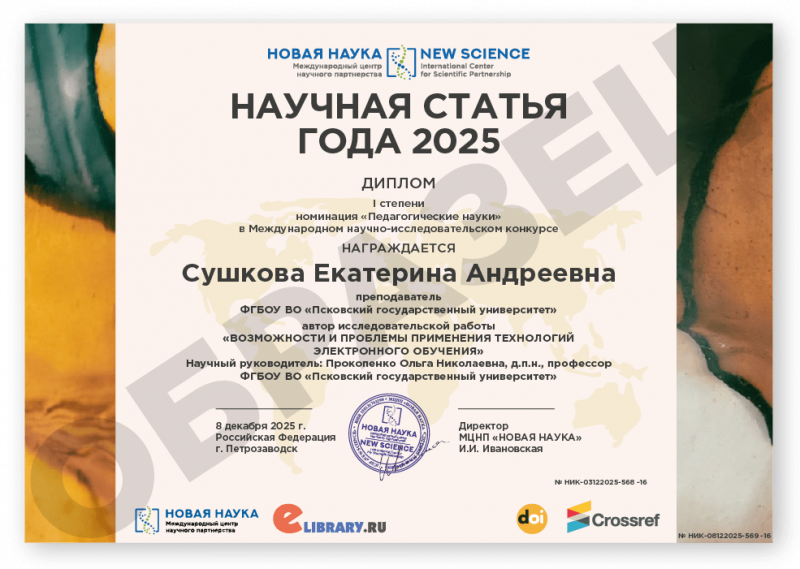Международный научно-исследовательский конкурс НАУЧНАЯ СТАТЬЯ ГОДА 2025 Код конкурса: НИК-569 Дата проведения: 8 декабря 2025 г. К участию в конкурсе принимаются статьи объемом от 5 до 12 страниц на русском и английском языках. Авторами одной конкурсной работы могут быть несколько человек. По итогам конкурса его участники получают: 1. Публикацию своей конкурсной работы (статьи) в сборнике статей конкурса «НАУЧНАЯ СТАТЬЯ ГОДА 2025». Сборнику присваиваются УДК, ББК, ISBN; 2. Именные Дипломы (I, II или III степени) по решению редколлегии; 3. Размещение сборника и публикации участника в Научной электронной библиотеке eLIBRARY (Договор №467-03/2018K); 4. DOI - международный цифровой идентификатор публикации (см. условия участия); 5. Бесплатный сборник статей конкурса «НАУЧНАЯ СТАТЬЯ ГОДА 2025» (в электронном виде); 6. По итогам конкурсов предоставляется выписка из Протокола рассмотрения и оценки конкурсных работ и другие необходимые для отчетности документы (по запросу участника). Сборник статей конкурса формируется в течение 5 дней после окончания приема конкурсных работ (статей) и будет размещен на нашем сайте в разделе Архив конкурсов. Оргвзнос: 990 руб. |