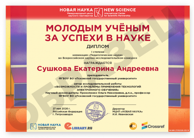 Всероссийский научно-исследовательский конкурс МОЛОДЫМ УЧЁНЫМ ЗА УСПЕХИ В НАУКЕ Код конкурса: НИК-630 Дата проведения: 27 мая 2026 г. К участию в конкурсе принимаются статьи объемом от 5 до 12 страниц на русском и английском языках. Авторами одной конкурсной работы могут быть несколько человек. По итогам конкурса его участники получают: 1. Публикацию своей конкурсной работы (статьи) в сборнике статей конкурса «МОЛОДЫМ УЧЁНЫМ ЗА УСПЕХИ В НАУКЕ». Сборнику присваиваются УДК, ББК, ISBN; 2. Именные Дипломы (I, II или III степени) по решению редколлегии; 3. Размещение сборника и публикации участника в Научной электронной библиотеке eLIBRARY (Договор №467-03/2018K); 4. DOI - международный цифровой идентификатор публикации (см. условия участия); 5. Бесплатный сборник статей конкурса «МОЛОДЫМ УЧЁНЫМ ЗА УСПЕХИ В НАУКЕ» (в электронном виде); 6. По итогам конкурсов предоставляется выписка из Протокола рассмотрения и оценки конкурсных работ и другие необходимые для отчетности документы (по запросу участника). Сборник статей конкурса формируется в течение 5 дней после окончания приема конкурсных работ (статей) и будет размещен на нашем сайте в разделе Архив конкурсов. Оргвзнос: 990 руб. |